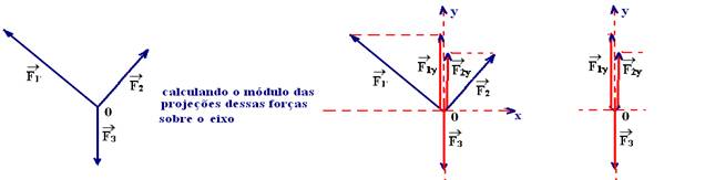 Utiliza-se com mais freqüência o método das projeções das forças sobre os eixos horizontal (x) e vertical (y), perpendiculares entre si. A soma das projeções sobre cada eixo deve ser nula. Exemplo: