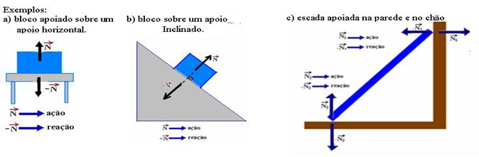 Força normal () – Força trocada entre duas superfícies sólidas que estão em contato comprimindo-se e que é sempre perpendicular à reta à reta que tangencia as superfícies no ponto de contato. Obedecem ao princípio da ação e reação e não se anulam, pois são aplicadas em corpos diferentes.