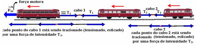 Exemplo: Trem puxando dois vagões através de dois cabos ideais 1 e 2.